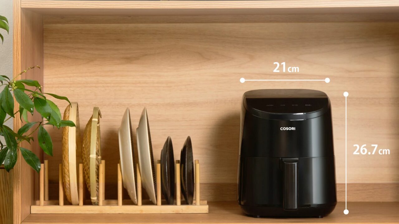 COSORI LITE 2Lの本体サイズは、幅21.1cm × 奥行25.6cm × 高さ26.7cmです。