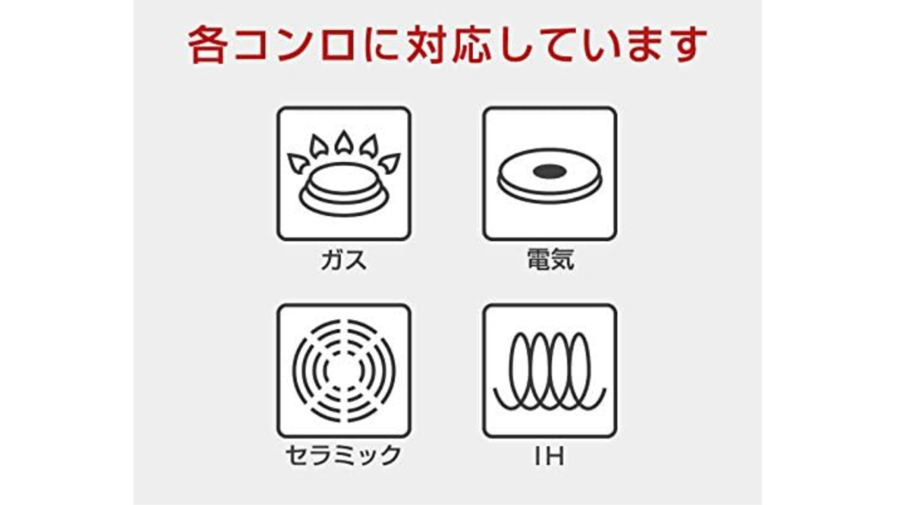 - IHやガスコンロなどほとんどの家庭用熱源に対応している