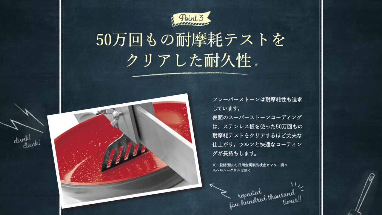 公式サイトによれば、フレーバーストーンの表面コーティングは、50万回の耐摩耗テストをクリアしたとされています。(参照:フレーバーストーン 公式ブランドサイト)